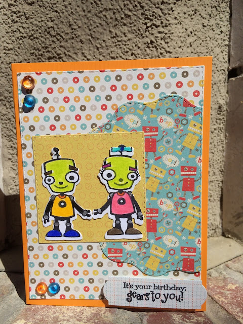 Carri at DOUBLE CLICK CONNECTIONS is having a "Robot or Monster Challenge" I used brand and blue skittles. I combined that with the current sketch Challenge at DIE CUTTIN DIVAS. The dies and stamps are all MY CREATIVE TIME. The papers are "Boy Crazy" by My Minds Eye. This is a short post-the DCD challenge ends soon.